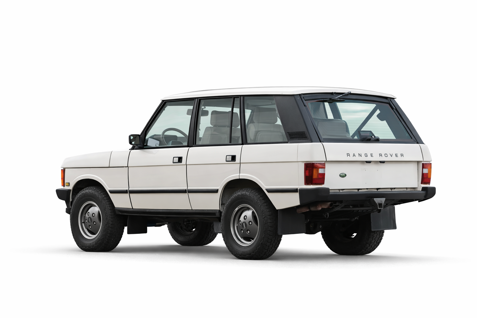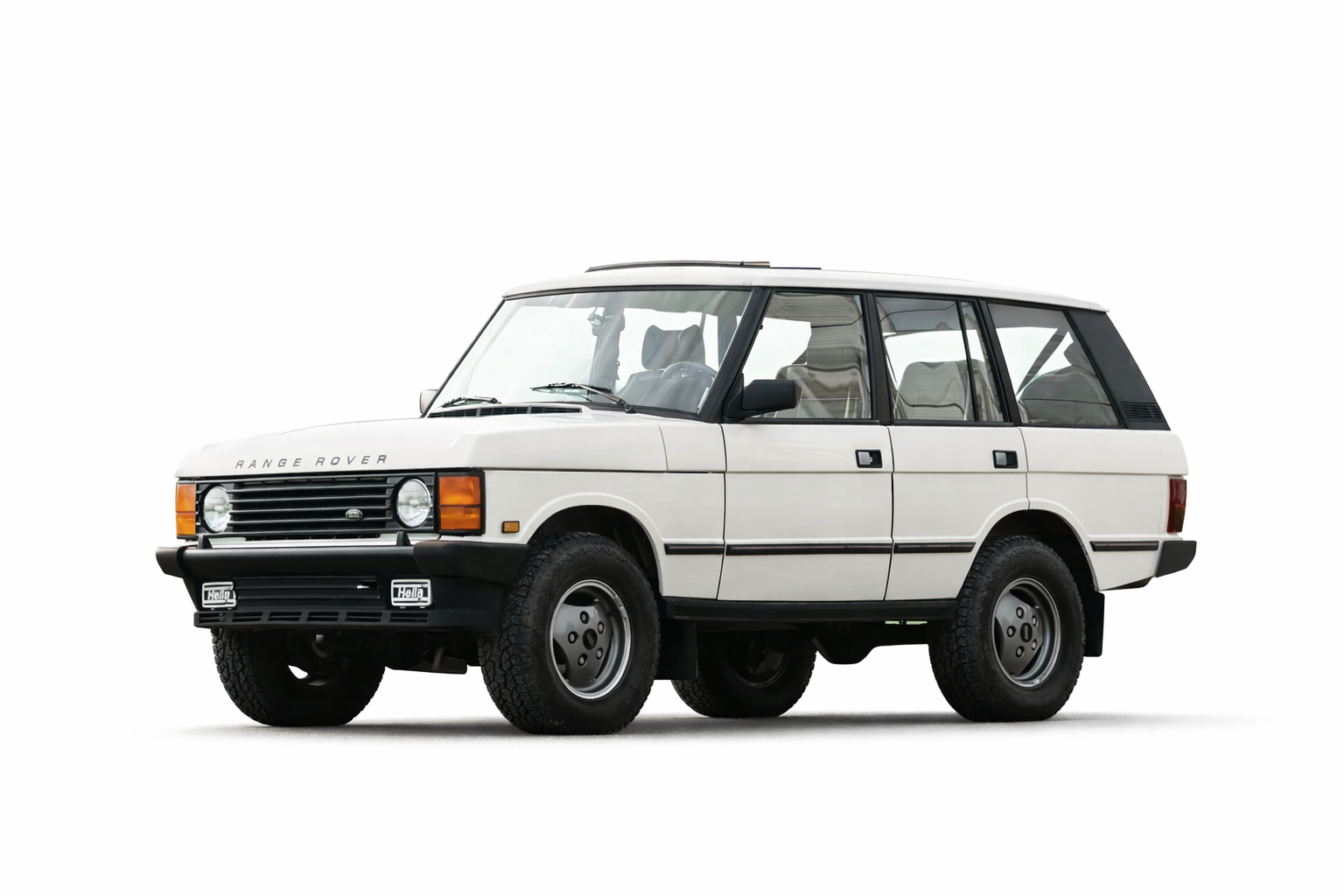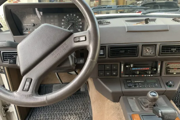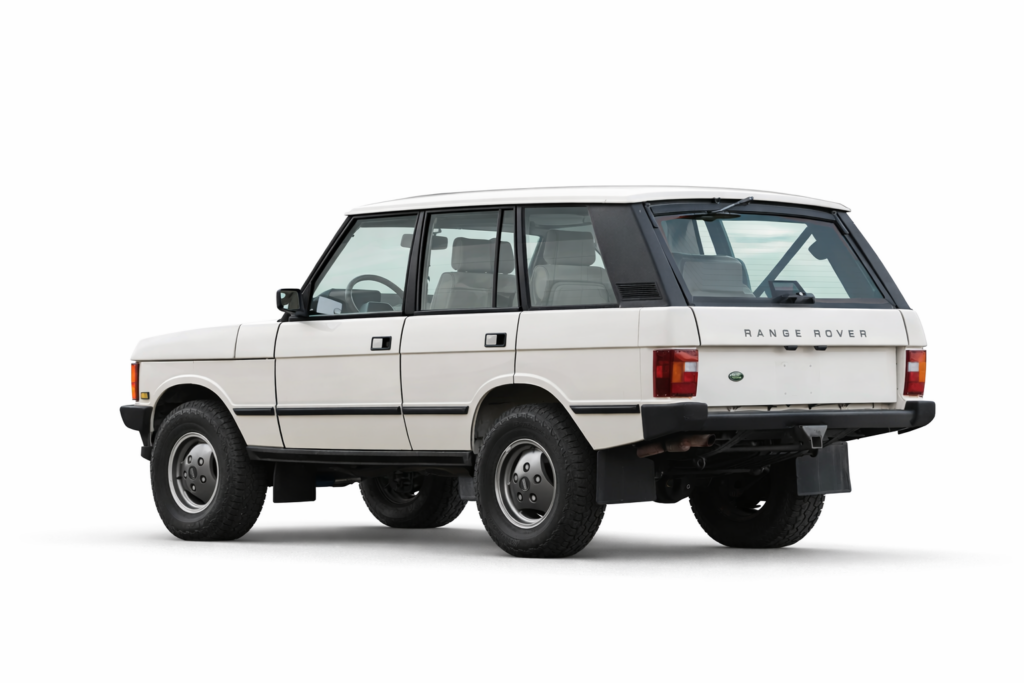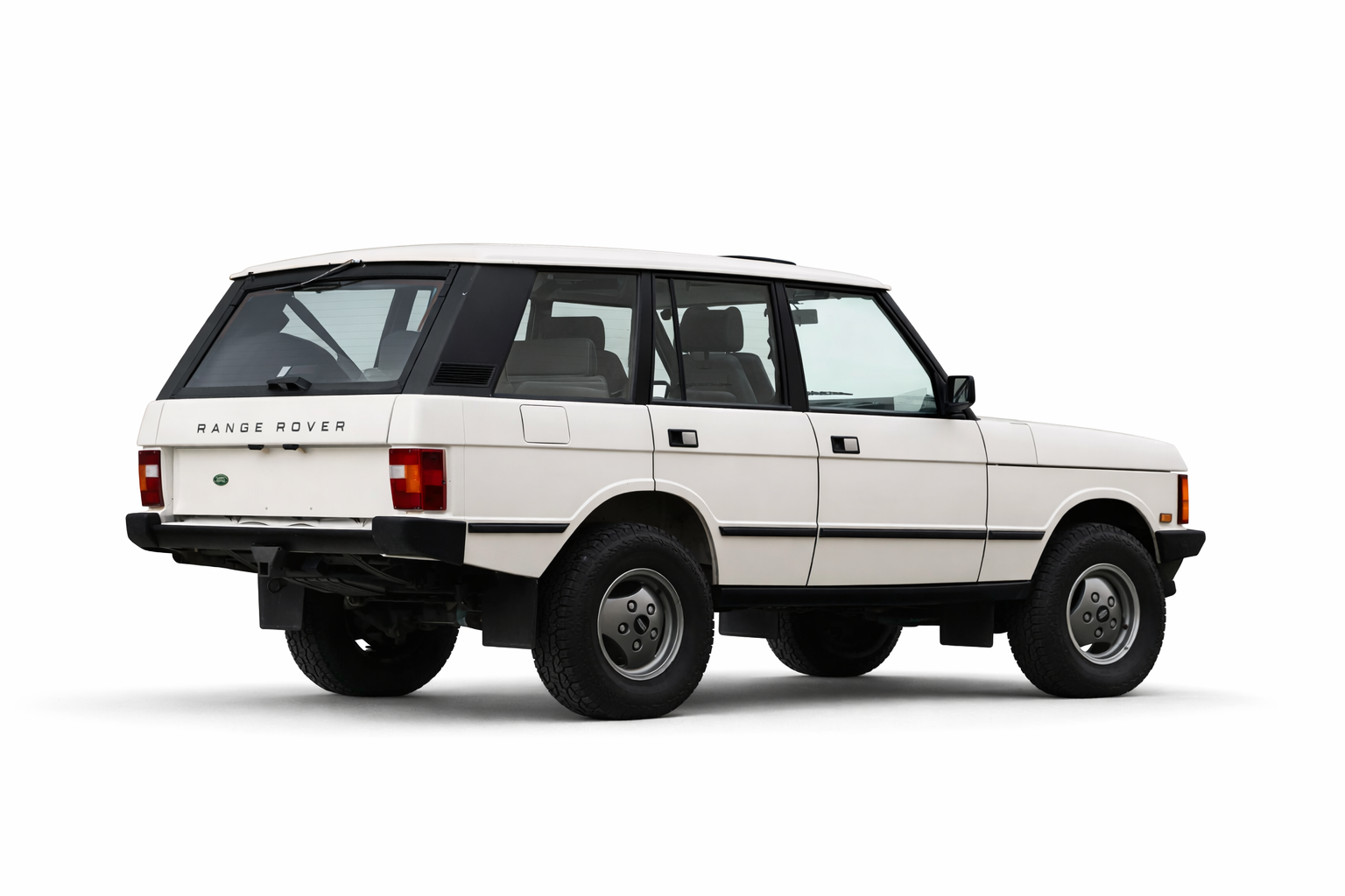 This 1992 Range Rover is a long-wheelbase example finished in Alpine White over Sorrell Beige leather. Its 3.9-liter V8 sends power to all four wheels through a four-speed automatic transmission and a dual-range transfer case.