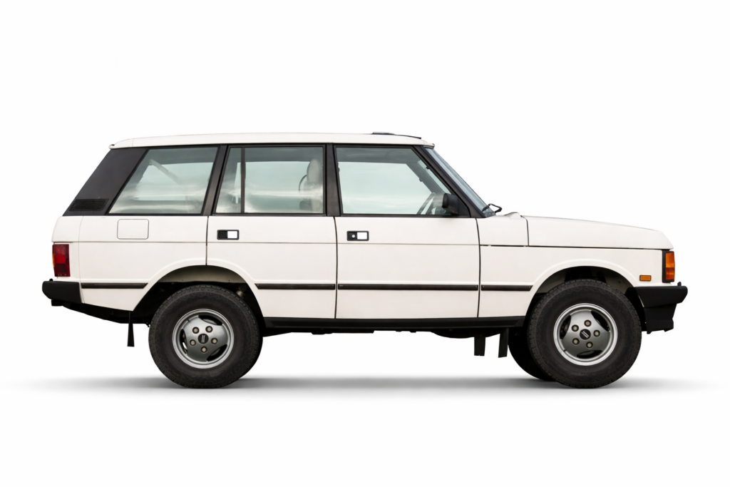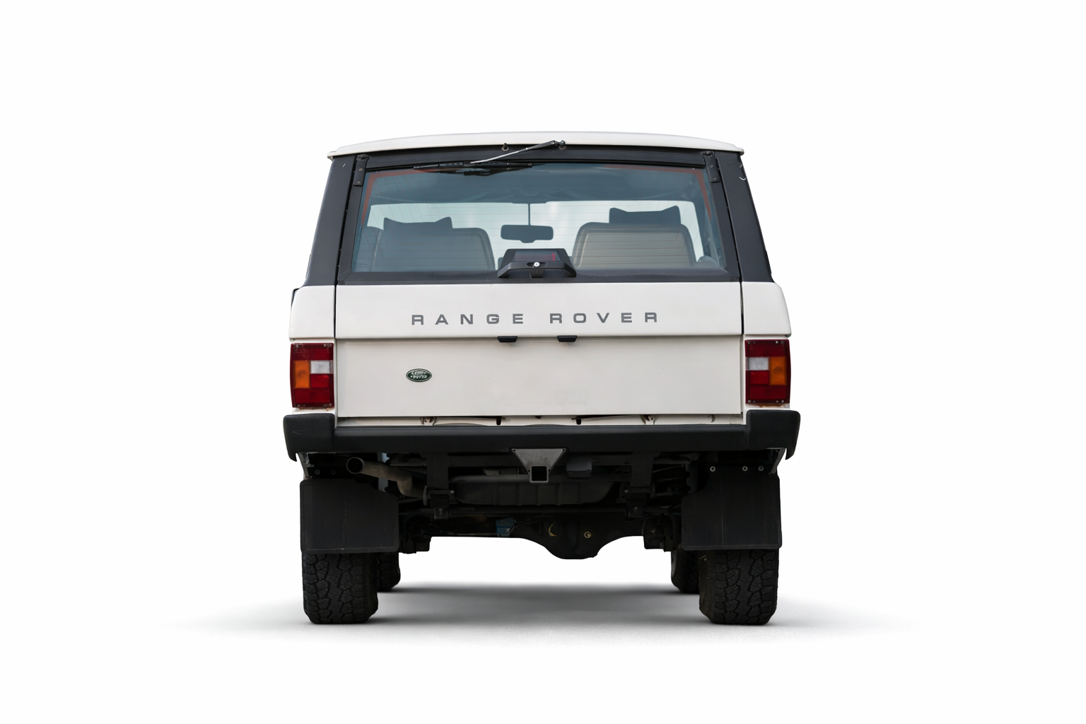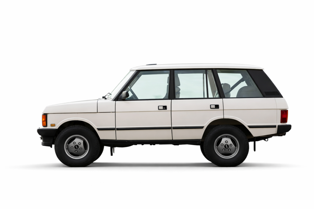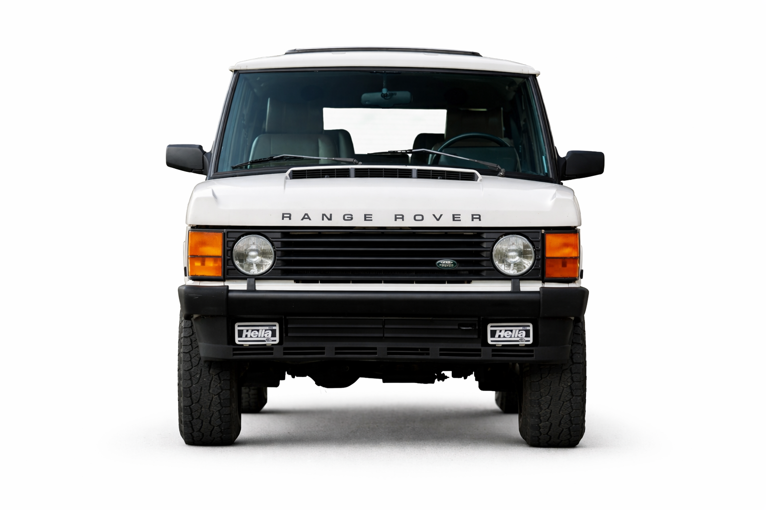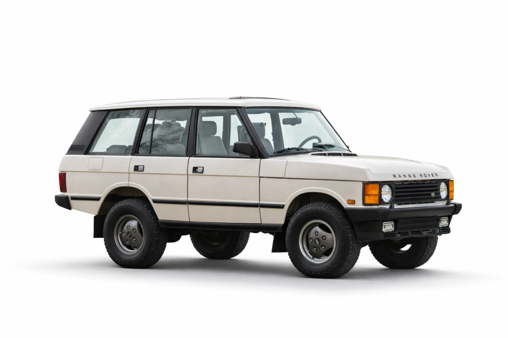 This 1992 Range Rover is a long-wheelbase example finished in Alpine White over Sorrell Beige leather. Its 3.9-liter V8 sends power to all four wheels through a four-speed automatic transmission and a dual-range transfer case.